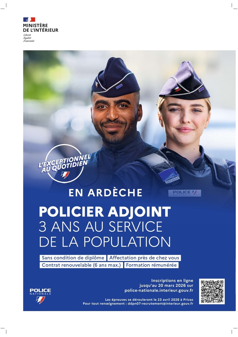 Inscription en ligne : https://www.police-nationale.interieur.gouv.fr/nous-rejoindre/inscriptions-aux-concours-et-selections/policier-adjoint-sud-est-departement-de-lardeche-07