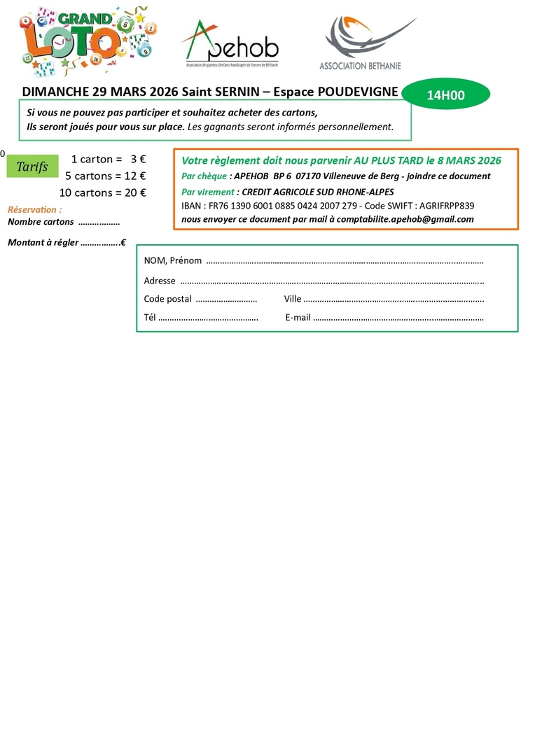 Loto de l'APEHOB : dimanche 29 mars 2026 à St Sernin