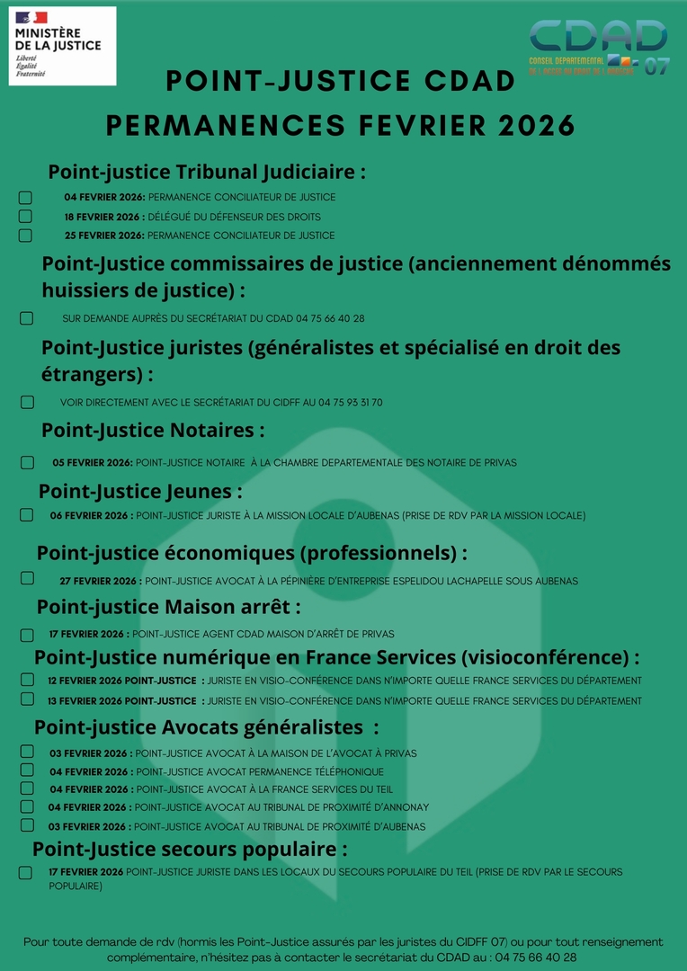 Dans le cadre de ses actions, le CDAD de l’Ardèche propose plusieurs permanences de consultations juridiques gratuites et ouvertes à tous. Ces permanences, appelées Point-Justice, sont organisées sur tout le département de l’Ardèche.