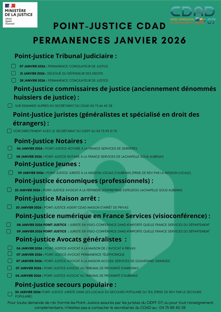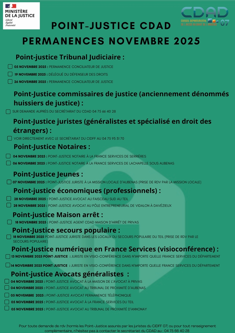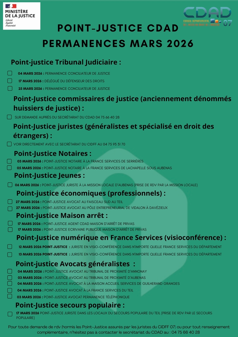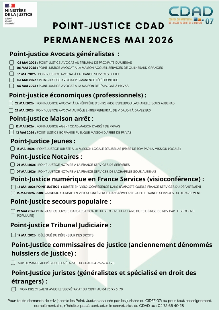 Dans le cadre de ses actions, le CDAD (Conseil Départemental de l'Accès au Droit) de l'Ardèche propose plusieurs permanences de consultations juridiques gratuites et ouvertes à tous. Ces permanences, appelées POINTS JUSTICE, sont organisées sur tout le département de l'Ardèche.Pour accéder à toutes les informations, cliquez sur le lien https://www.cdad07.fr/